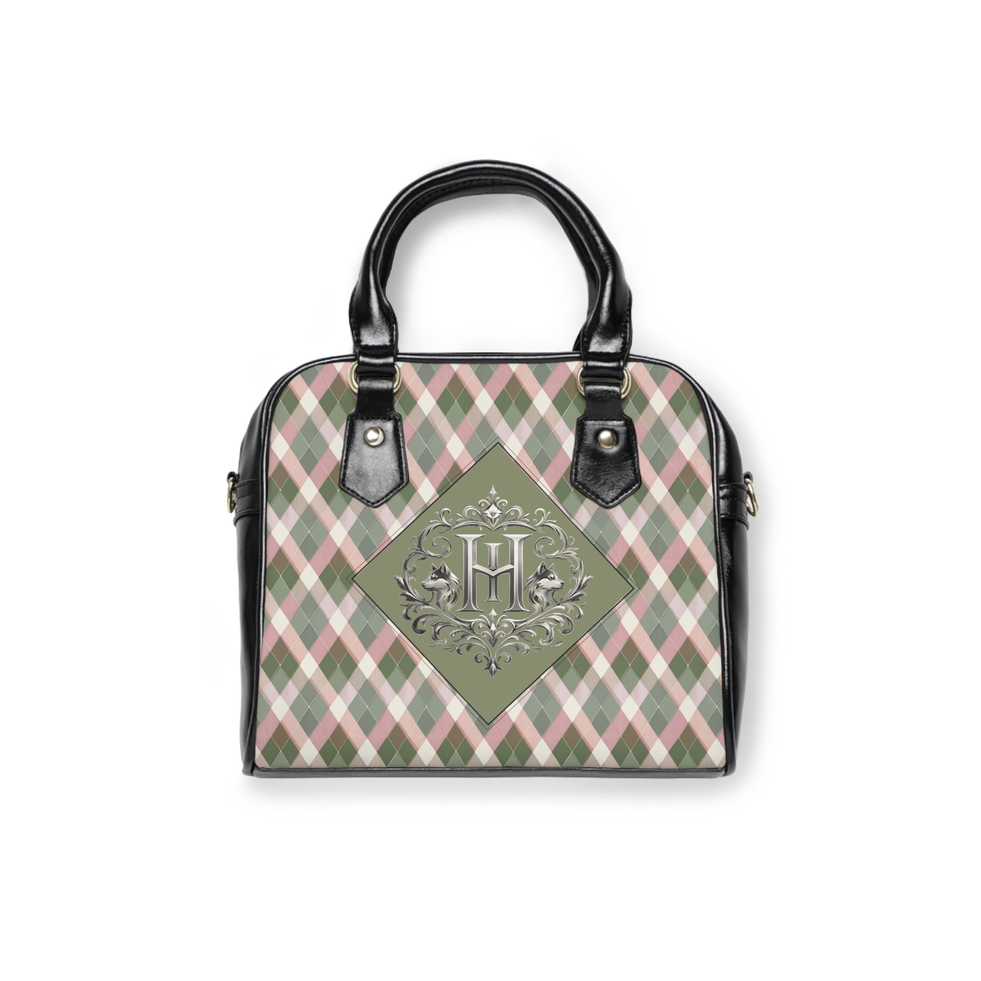Monogram Plaid Shoulder Handbag — Green Argyle Pattern with Elegant 'H' Emblem