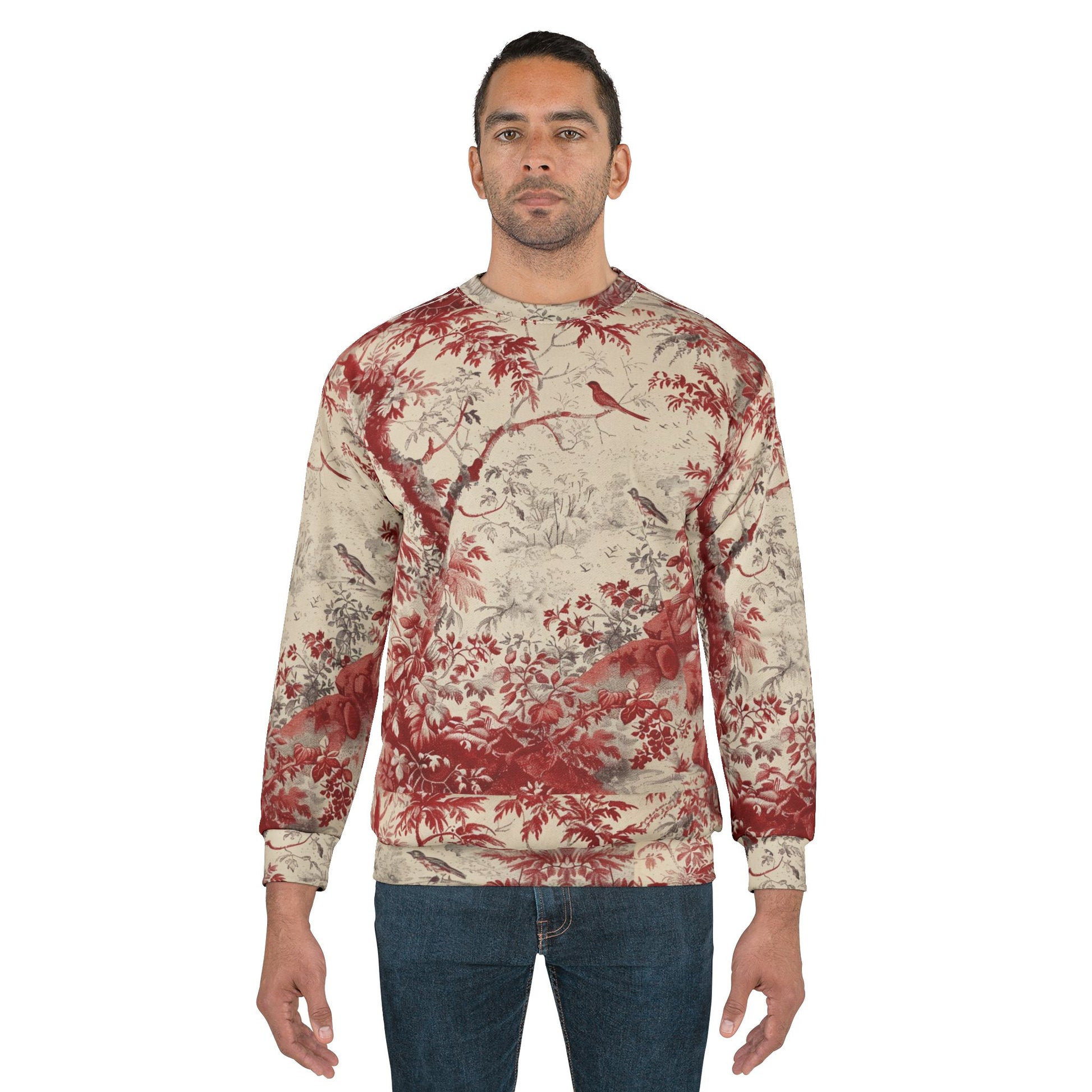 Toile de Jouy Scenic Sweatshirt — Vintage Red Botanical & Bird Print